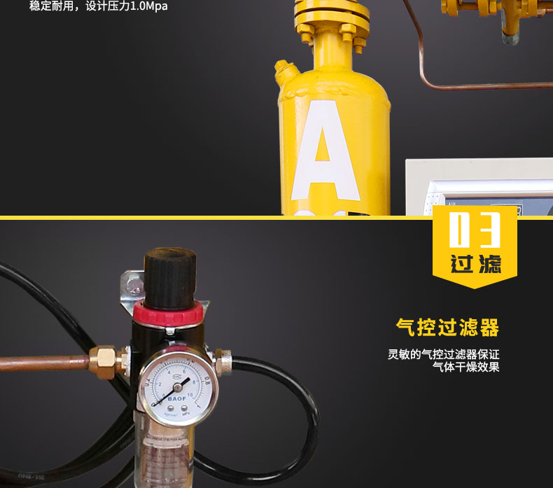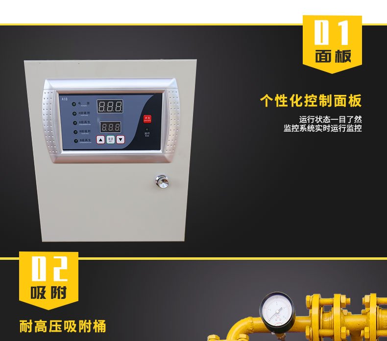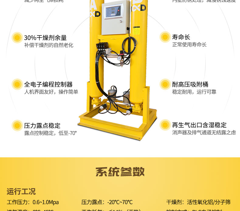 塔床阻力小,減少再生氣體損耗 冷鍍鋅防銹,內壁防銹處理,減慢銹蝕速度 30%干燥劑余量,補償干燥劑的自然老化 全電子編程控制器,人機界面友好、操作簡單 耐高壓吸附桶,穩定耐用