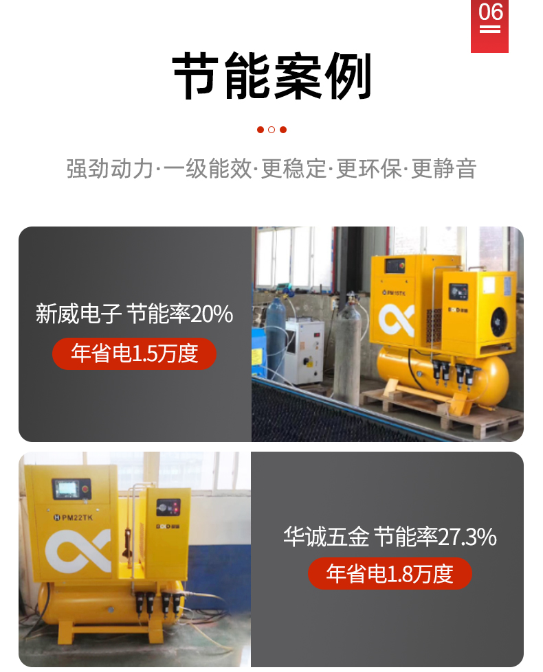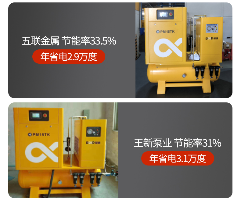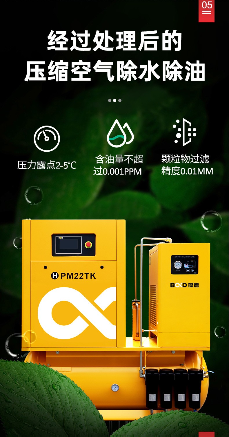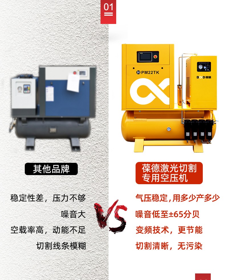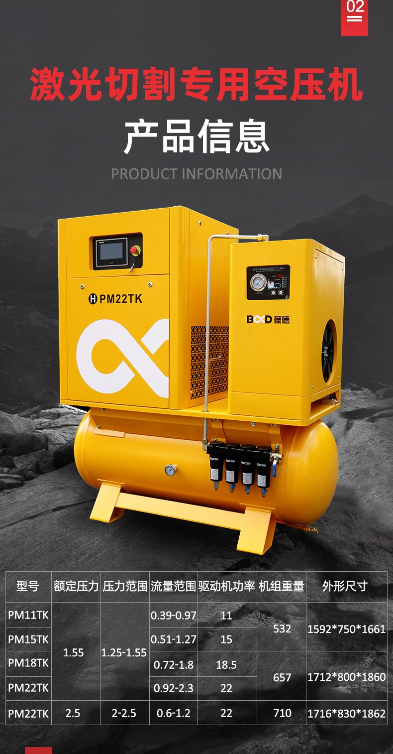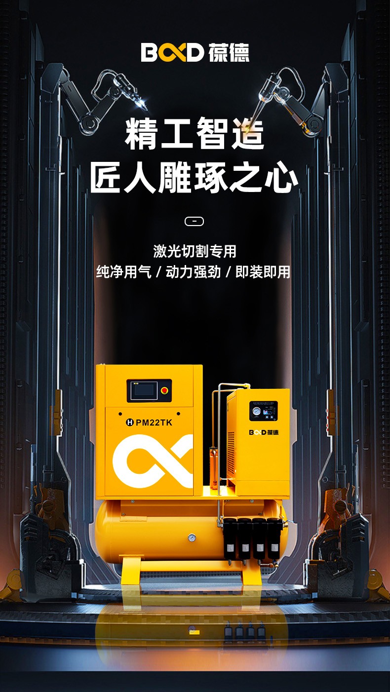 葆德激光切割專用空壓機特點:四重過濾,干燥純凈,一體式集成,安裝方便,永磁變頻螺桿機,壓力穩定,切割更流暢,型號:BD-PM11TK-16、BD-PM15TK-16、BD-PM18.5TK-16、BD-PM22TK-16、BD-PM18.5TK-25、BD-PM22TK-30